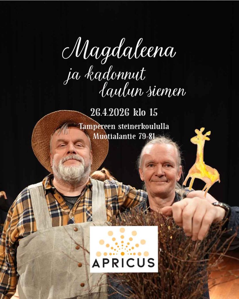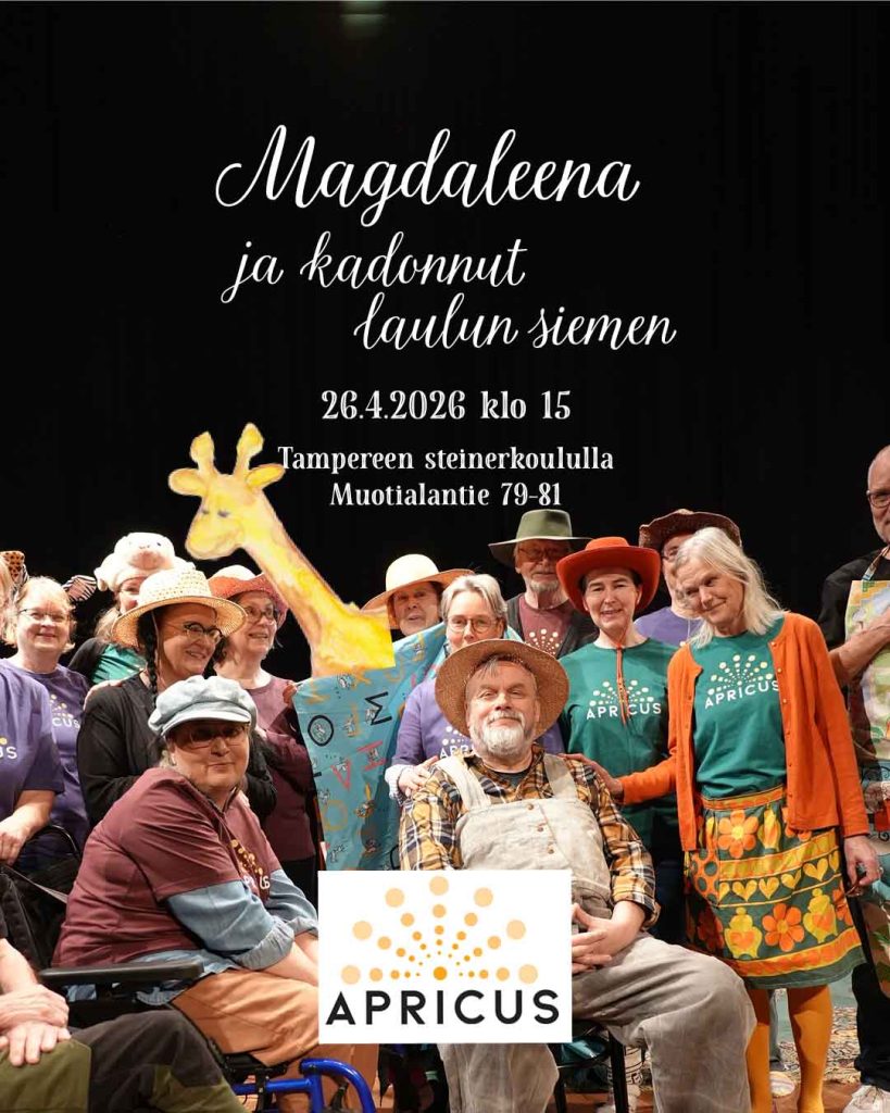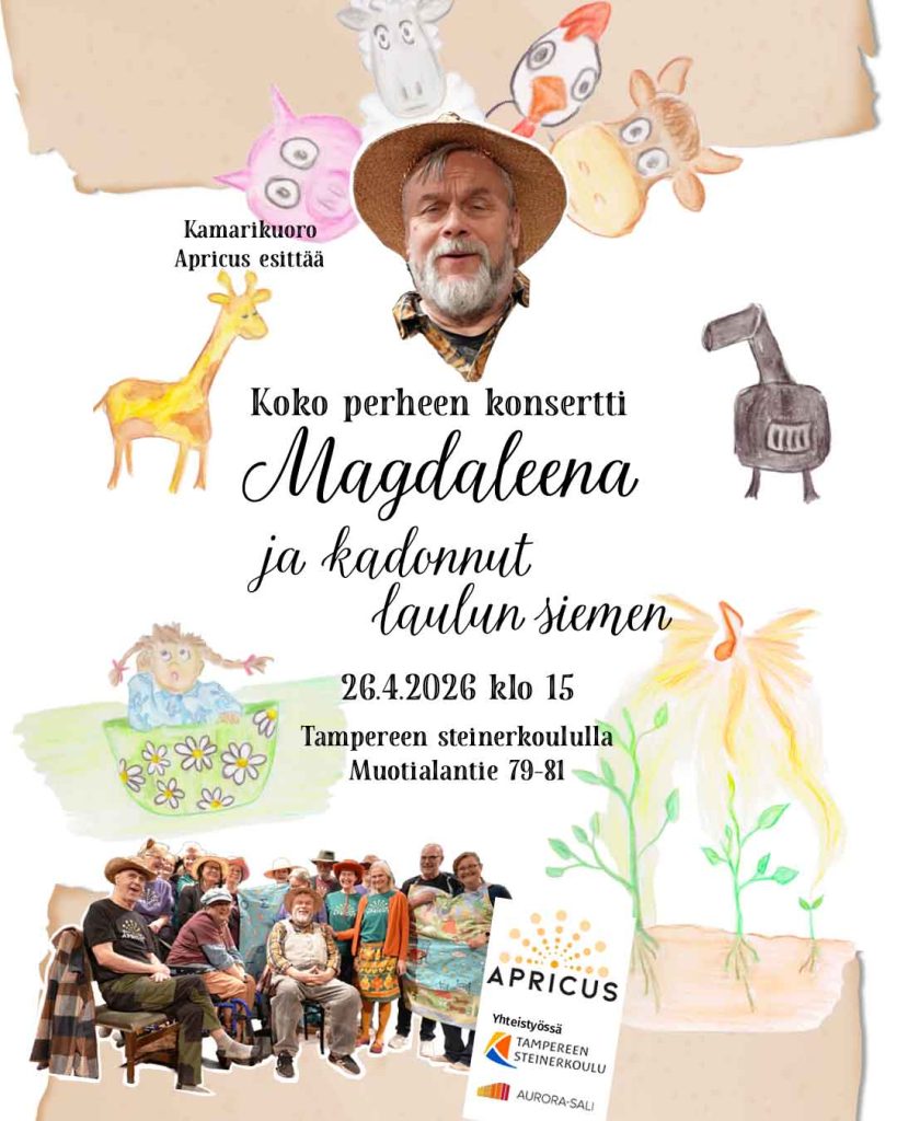 ++ Kamarikuoro Apricus ja Tampereen steinerkoulun 4A-luokka esittävät koko perheen konsertin Magdaleena ja kadonnut laulun siemen 26.4.2026 klo 15 Tampereen steinerkoulun Aurora-salissa osoitteessa Muotialantie 79-81, Tampere.